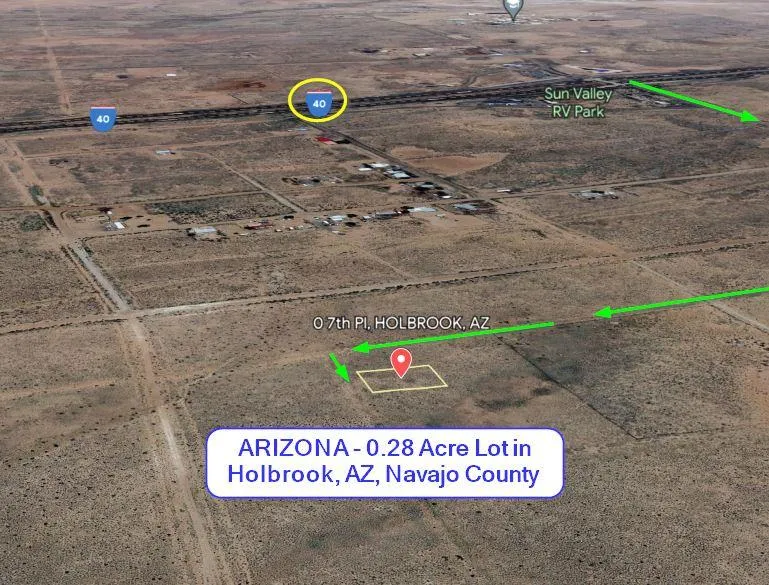 0.28 acre lot in Holbrook, Arizona just 1 mile off Interstate 40 and 19 miles to the Petrified Forest National Park, where 645,000 visitors go each year, making this a great vacation location and place to camp when visiting the park. There is no HOA, this property is not in a flood zone, and the property taxes are only $11 each year. The town of Holbrook, population 4,500, is 3 miles away for groceries, gas, hardware, banking and all the amenities you'll need. Own this property and have a place to park your RV or travel trailer when visiting the Petrified National Forest.