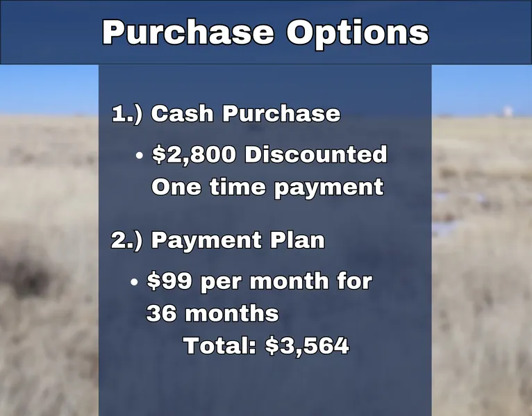 Your land-buying journey begins with a simple down payment of $99. With a term length of 36 months, you have the flexibility to choose your preferred due date each month for your payments. We aim to make the process of buying your dream property quick, stress-free, and easy.
