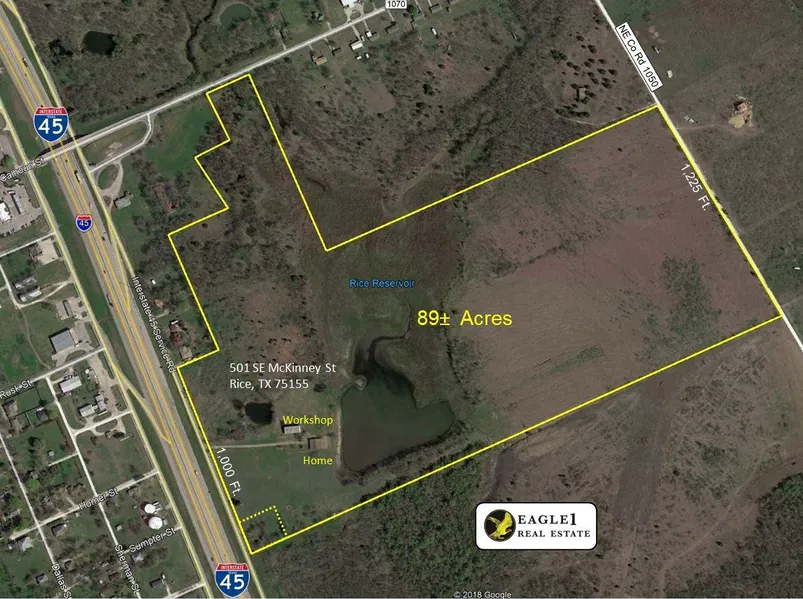 89 acres with up to 1000 feet of road frontage on both I-45 and County Rd 1050. The property features a lake, and existing 3 bedroom and 2 bathroom mobile home as well as a 2,500 SqFt metal workshop. The location is suitable for a commercial building with visibility on I-45 and it also has pasture acreage on a county road which can be used for a family ranch or residential development. The lake offers excellent fishing and duck hunting and provides a scenic backdrop for a home or hunting lodge. Part of the property includes floodplain area. Come visit this property to see the possibilities.