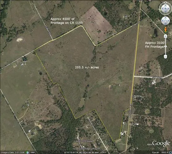 Approx. 7500' of road frontage on this 205.5+- acs. This property could easily be subdivided for small site built home ranchettes or kept in tact for ranching. 4 ponds total. Land is rolling with some hardwoods. Property has an approx 454' high elev to approx 409 low elev. Great property out of any city limits, but close to town. App 3000' of FM fntg & 4500' of CR frontage.