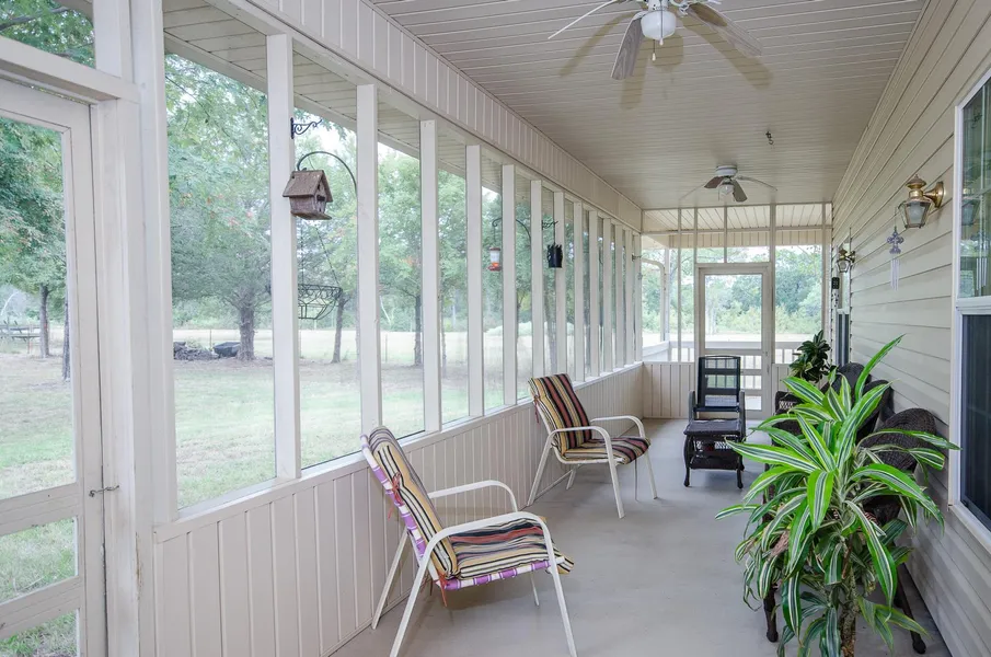 Country living in this lovely 3 bdrm, 2.1 bath home with large covered front porch on 18+ acres! Spacious, open living concept with vaulted ceilings, built-in entertainment area, brick WB fireplace, split bdrms and large screened in back patio. Huge master with French doors out to private patio & large master bath with corner garden tub, walk-in closet & double sinks. Fenced & crossed fenced with stables, oak trees & storage or workshop on slab.