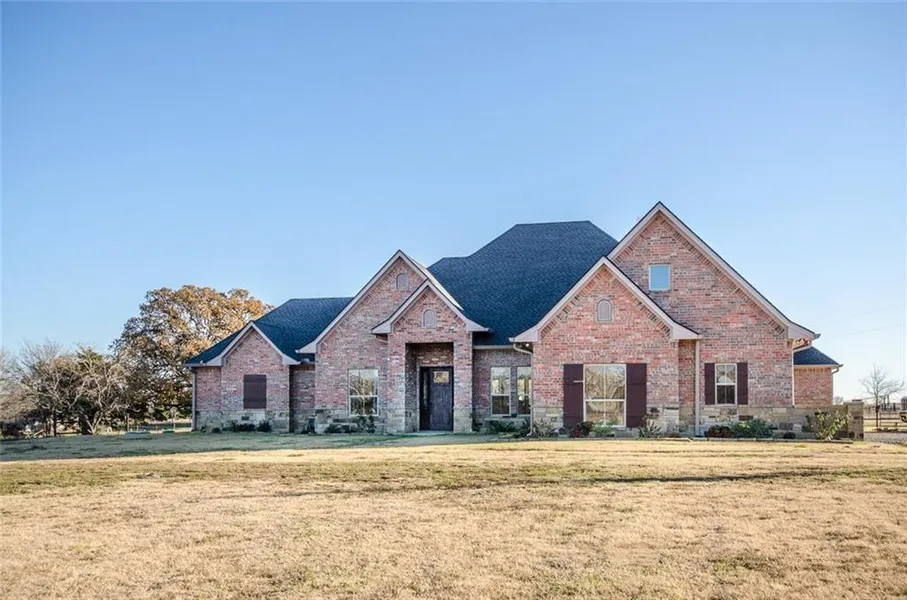 Beautiful country home with 15 +or- acres with pond & barns. Open living concept with oversized living room with wall of built-ins, dining & breakfast area, kitchen with island, plenty of cabinet space and stainless appliances. Custom cabinetry throughout house; office, study and exercise rooms; granite; stained concrete floors and more. Master suite with tray ceiling, bath has his & her closets, large jetted tub and a tiled walk-through shower. Upstairs bonus room could be a 4th bedroom with half bath. Spray foam insulation and top of the line security system. Large fenced backyard, back porch with fireplace and wired for TV. Huge barn with squeeze chute and pen.