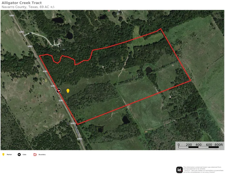 Alligator Creek Ranch: 69-acre Texas property in Navarro County. Creek Tract has 2,500 ft of Alligator Creek, 2 stock tanks. Paved road frontage, electricity available via Navarro County Electric Coop. Water available through Corbett Water Supply Corp. Abundant wildlife incl. deer, hogs. Flat terrain with seasonal draws, adorned with diverse trees (post oaks, pecans, cedar elm, hack-berry, mesquite, mountain cedar, scrub oaks). Ideal for recreation and mixed-use development. Tax amount not correct, will be determined with new survey.