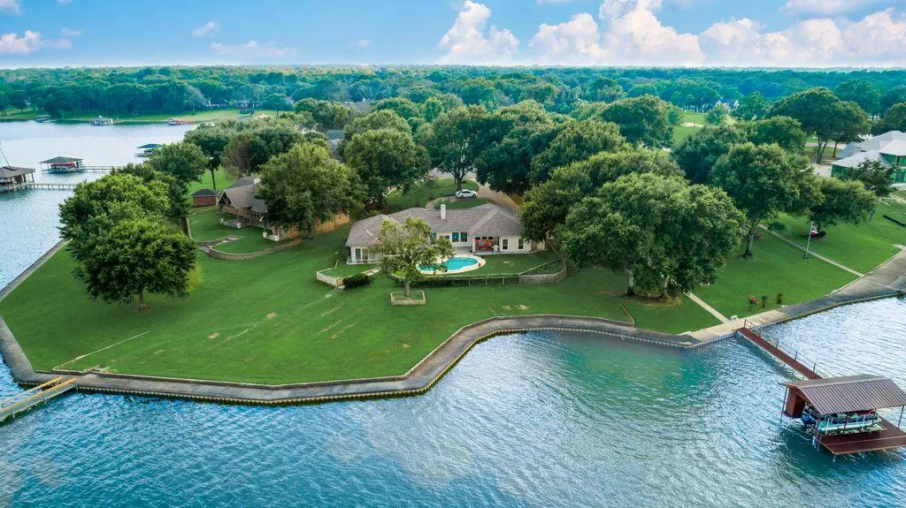 Premier Point location lot in Azure Bay with 250 feet of waterfront, retaining wall, sidewalk with boathouse and gunite swimming pool. Home is a contemporary style and features a unique Dual Bedroom Suite on one end with two bedrooms, A huge walk-in Closet, Shower, jetted tub, and separate half bath quarters. There are two bedrooms on the other end of the house with a Jack and Jill Bath. This home also features two living areas, fireplace, office, built-ins, an additional half bath, and an oversized garage. This home was built ahead of its time with all the charm of the modern look that is so popular today!