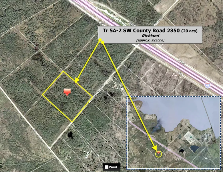 Research Parcel InformationS on I-45 to Rest Area exit. Stay on service road past rest stop, at over pass take a right on CR 2350 (you cannot see the CR sign) at 0.3 miles to property starts on right and ends at 0.5 miles at the sign.