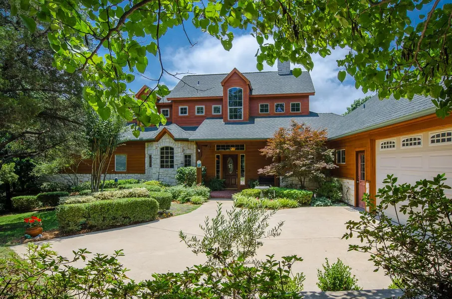 Upon approach to this wonderful hideaway, you are greeted by shade trees and the sound of the water. Then as you make your way down the drive you are greeted with a two-story Austin Stone bungalow-style home accented completely with cedar siding and posts on all corners of the porches and patios.
