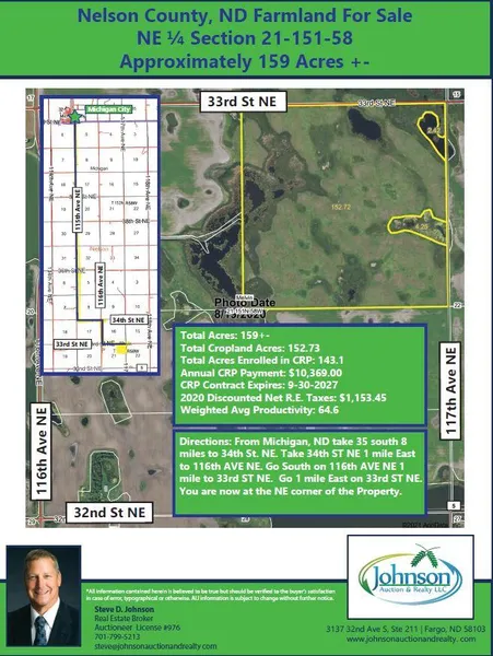 Research Parcel InformationFrom Michigan, ND take Hwy 35 South 8 miles to 34th St. NE. Take 34th ST. NE 1 mile East to 116th Ave NE. Go South on 116th Ave NE 1 mile to 33rd St NE. Go 1 mile East on 33rd St. NE. You are now at the NE corner of the Property.