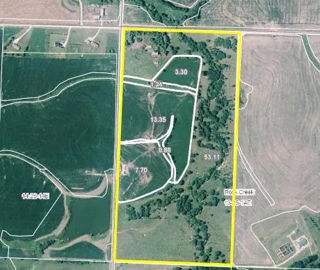 This farm is located at the intersection of X and Kansas Road on the South edge of Sabetha, Kansas. The 55 acre farm has 25.5 cropland acres and 30 acres of pasture.