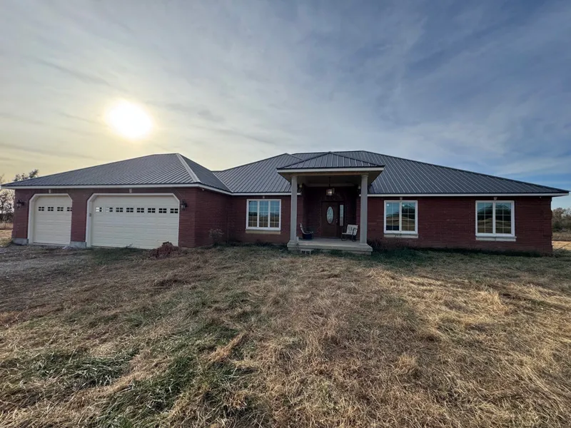 Enjoy the beauty of country living on 73 scenic acres with this classic brick home, thoughtfully designed for comfort, functionality, and style. Overlooking a peaceful pond and surrounded by open fields, this residence combines timeless craftsmanship with modern conveniences. The durable metal roof and solid brick construction ensure long-lasting quality, while the open floor plan creates an inviting flow throughout the living spaces. A spacious great room welcomes you with natural light and picturesque views, seamlessly connecting to a bright, well-equipped kitchen. The formal dining room offers an elegant setting for entertaining, while a private office provides the perfect space for working from home or managing daily tasks. The primary suite serves as a relaxing retreat, complemented by additional bedrooms ideal for family or guests. Step outside to enjoy expansive views, gentle breezes, and the tranquility of your own fully stocked pond. With 73 acres of open land, there's ample space for livestock, recreation, or future expansion. This exceptional property blends rural charm with refined living - a rare opportunity to own a private retreat just minutes from town conveniences.
