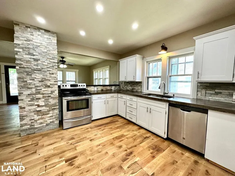 On South Lincoln in Chanute, this 3 bedroom, 1 1/2 bath home is ready to surprise you. The current owners have spent a lot of time creating an excellent interior space with a modern, yet rustic feel. Highlights include solid wood flooring in the main living area, updated bathrooms, and a beautiful stone accent wall next to the new kitchen with concrete countertops. You'll also find a large living area and office space, or potential 4th bedroom on the main floor (no closet). A bonus room in the rear of the house offers many options for use. Located upstairs are 3 bedrooms, very large closets for each, and a full bathroom. The home has 2 separate central heat/air units so you can keep a comfortable temperature both up and down in all conditions. The basement provides additional storage and shelter. Put your own finishing touches on this property and enjoy relaxing on the large front porch.