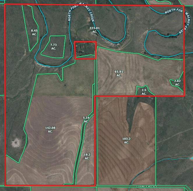 The land consists of approximately 471 total acres, with 227 acres of productive tillable ground and 244 acres of native grass and creek bottom. Over two miles of Walnut Creek cuts through the property, providing a dependable year-round water source for both livestock and wildlife. The shaded creek corridor offers natural protection from the steady western Kansas winds while also serving as a vital travel route for game. The entire pasture is enclosed by sturdy boundary barbed wire fencing. Roughly 125 acres are currently planted to milo, with plans to rotate into wheat following harvest, supporting consistent yields and maintaining soil health. A verbal lease is in place with a trusted local farmer through the 2026 growing season, providing both income stability and a seamless transition for new ownership. This property also lies 6 miles from both Hwy 96 and Hwy 4 allowing you great access to numerous grain elevators. The current tenant is an experienced and respected producer who has managed the property well and is open to continuing under new ownership. A large rock outcropping overlooks the entire farm, offering sweeping views across the creek bottom and tillable fieldsa perfect vantage point for watching the sunrise or sunset over the Kansas prairie. The blend of income-producing farmland, strong grass country, and scenic natural features make this a truly well-rounded and versatile property.