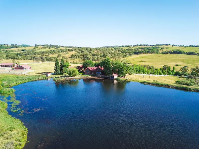 One Of A Kind! Stunning Custom Canadian Spruce & Pine Log Home fronting a private 7-9+/- Ac Spring Fed Lake in a picturesque valley setting between Sacramento and Lake Tahoe. 2 Separate parcels. River Rock gated entrance. Finely crafted chinking and finishing touches throughout. Pella Doors & Windows. High end custom blinds. Walk in kitchen pantry. Lots of closets. Jack & Jill bath with two separate showers. Natural stone, carpet, & hardwood flooring. Hand sanded and newly stained exterior. Covered boat dock including a Pontoon Boat. Seasonal creek. 12 Miners Inches of NID irrigation water. Domestic well. Freeform Black Bottom pool w/ waterfall. Several barns, equipment & feed storage, arena, paddocks, white rail fenced pastures, attached garage and detached garage & shop with caretakers apt. 2 bd 1 bath Modular. RV/Vehicle storage. Some equipment and livestock may be available.