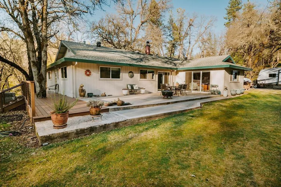 Come escape and enjoy nature on your private 5 acre parcel with a seasonal creek. 2 bedrooms plus a custom office and bonus room. Plenty of room for animals, a fenced garden, & RV pad with hook ups. Extra detached out-building just steps away from the house. The home features a large central gathering area with vaulted ceilings. Versititly is afforded with two bedrooms on one side of the home and a private room for many uses on the other that can be used for another bedroom, homeschool room, 2nd office, multi generational living or game room. The kitchen is a gourmet dream kitchen with custom cabinetry with all the bells and whistles. Plenty of entertaining spaces both in the home or on your large concert outdoor patio. Many upgrades including, newer kitchen and bathrooms, newer roof, newer wrap around front and side decks, newer windows and more. This is all included in this lovely single-story home minutes away from shopping and school