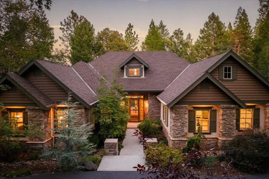 Sophisticated Craftsman! Extreme panoramic Sierra Snow Cap Views from this stunning home on 6.62 acres in the highly sought after Sierra Woodlands Sub. Enter through the atrium glass, double doors to an inviting foyer offering breathtaking views to the Sierra's. Slate flooring provides warmth and depth as you enter the spacious Chef's kitchen appointed with a Viking range, Subzero refrigerator, center island, custom wood cabinets, granite counters and a large walk in pantry. Built-in buffet and phone/writing desk area. Spectacular timber framed vaulted great room ceiling showcasing an impressive stone fireplace. Wood cased windows with views from every room. Large office, 2 guest bedrooms and spacious master suite w/triple crown molding and recessed lighting complete the main level. Master suite enjoys outside access to a private patio and spa offering magnificent sunrises over the Sierr...