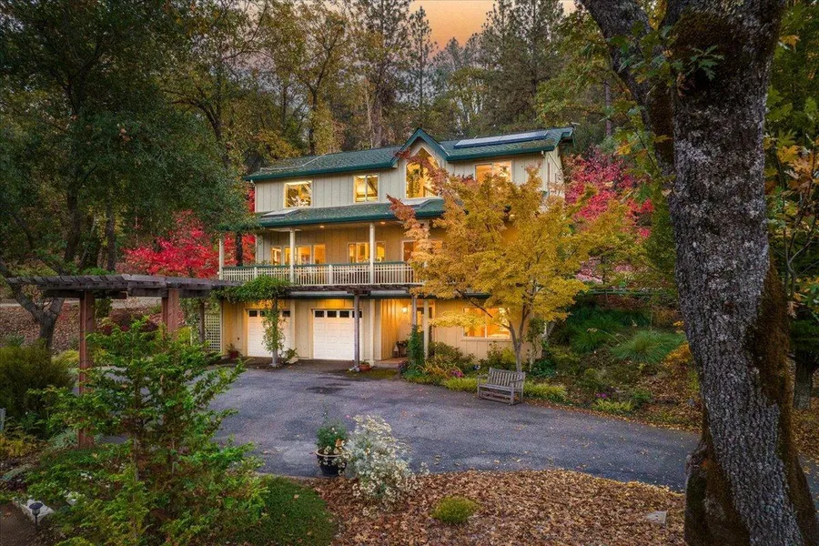 12.28+/- acres. Gated privacy in an estate setting. Geothermal heat and solar amenities. Water features, koi pond, rose gardens, maples & decorative plants and trees. An incredible landscaped setting with colorful views from every window. Home to the largest Digger Pine in the world. Patio great for outside dining. Potting shed and seating areas throughout the gardens. 2-1500 gallon water storage tanks, 4" of NID irrigation water, domestic well. A serene setting for an avid gardener to enjoy. Quiet spaces for relaxing offering many possibilities and ways to experience this special property.
