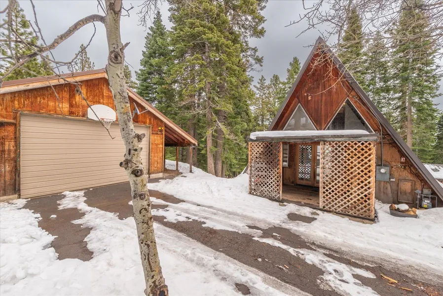 11485 Lockwood Drive is nestled in a serene cul-de-sac within the Prosser Heights neighborhood. Enjoy the tranquility and peaceful seclusion on a rarely found sprawling acre of land; meanwhile still being conveniently close to Downtown Truckee. This home offers that "cabin-in-the-woods" feeling while only being a short distance away from all the amenities and attractions the area has to offer. Imagine the possibilities of this cozy and classic two-bedroom, one-bathroom A-frame waiting to be renovated to your taste and style. The potential is endless to create your dream mountain retreat! A significant value-add is the expansive garage with high ceilings and a flat driveway, making year-round access a breeze. Whether you're storing your outdoor gear or need space for hobbies and projects, this garage has you covered.