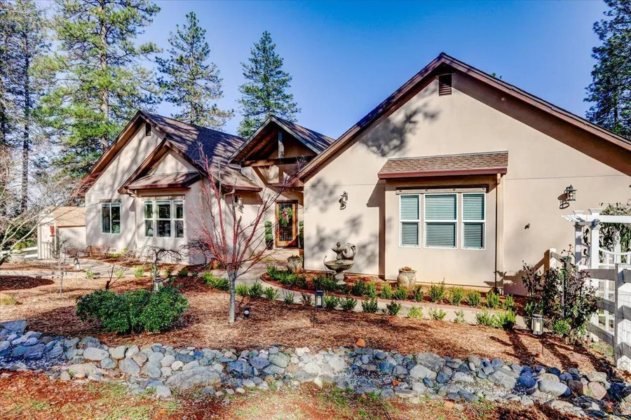 Elegant, classy two-story home located in the desirable Evergreen Ranch development located minutes off Hwy 49 and Grass Valley. White board fencing invites you into this lovely open floor plan with all day to day living on the main level! High quality features are throughout this serene home include Hickory cabinets and granite counters in the gourmet kitchen, large surrounding windows and glass door; which invite the beautiful natural light throughout! Three generous bedrooms including the large romantic suite which is separate from the guest bedrooms! The lower level offers a great family room, 4th bedroom and 3rd bath, plus an additional bonus room, currently used as a garden room (great gym too!) The lower level is ideal for an ADU with indoor/outdoor access! The inground saltwater swimming pool and waterfall make this a destination home for the masses! Better yet, solar is paid for with a transferable warranty! The private front yard has a hot tub inside a delightful, heated gazebo!! Two large outbuildings for the hobbyist, 3-car garage and RV parking. Move into a home that feels brand new!