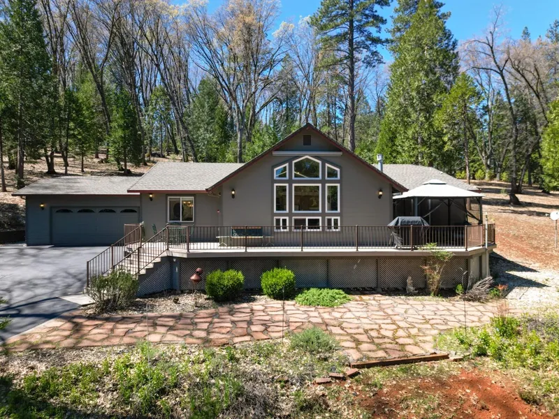 Immaculate one-story home on a manicured, oak-studded low maintenance parcel that shows off the Sellers' attention to detail maintenance! Dramatic open floor plan with vaulted ceilings and windows to invite the outside indoors! The great room enjoys the natural light and opens into the cook's kitchen for easy entertainment! Formal dining room will seat 10 comfortably and the huge front deck overlooking this breathtaking parcel can accommodate large parties! 4 bedrooms including a romantic primary bedroom which opens out to the deck! Attached two car garage and detached 575 SF detached RV garage and paved circular driveway! Fiberoptic internet! Located close to Grass Valley and yet a lovely sense of privacy!