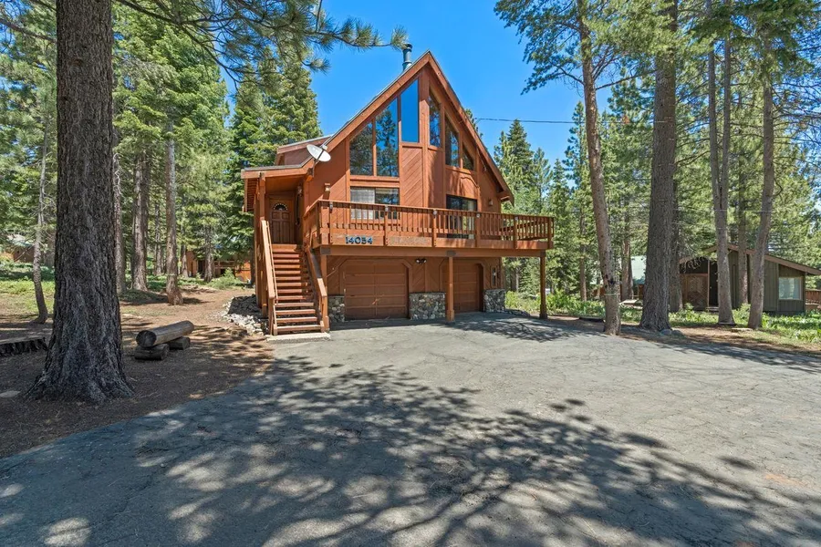 This beautiful Tahoe Donner chalet-style home is nestled on a secluded corner lot amidst the pines, offering a perfect combination of rustic charm and modern comfort. The spacious, well-maintained retreat features soaring ceilings, south facing windows and an inviting wood-burning fireplace. The recently updated kitchen and bathrooms enhance the home's contemporary appeal. On the main floor, you'll find a great room that seamlessly combines the living, dining, and kitchen areas, along with two cozy bedrooms and a guest bath. The upper level includes a spacious master bedroom with an en-suite bath and an airy loft, creating a private sanctuary. The lower level boasts a generous bonus family room, complete with a full bath and bar, ideal for hosting guests or unwinding after a day of adventure. A large deck off the front living area is perfect for BBQs and relaxation, allowing you to fully immerse yourself in the surrounding nature. Located in the desirable Ski View Loop neighborhood, this home offers close proximity to Trout Creek Recreation Center and The Lodge, making it an ideal blend of convenience and serene retreat. Don't miss the opportunity to own this exceptional property!