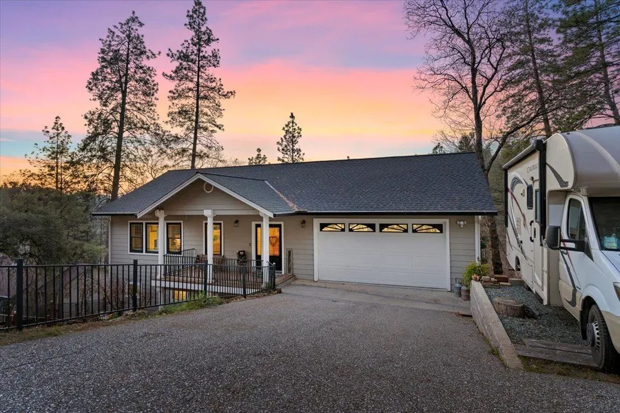 Custom home built in 2007 shows true quality construction. Open floorplan w/rich engineered wood flooring throughout & new Anderson vinyl windows to impress. Vaulted ceilings, beautiful plantation shutters & cozy gas fireplace make the living room a welcome place. The dining room features coffered ceilings open to the expansive entertaining deck. Modern kitchen offers maple shaker cabinets, granite counters, breakfast bar, upgraded 5-burner Kenmore Elite range w/convection oven, SS refrigerator included & walk-in pantry. 3 large bedrooms plus office or 4th bedroom on lower level. Large primary suite w/jetted tub & travertine shower offers access to lower deck engineered for the newer 6-person Jacuzzi hot tub included. Generous laundry w/sink & ample storage w/ Samsung W&D included. More upgrades include new ceiling fans, Leafguard gutters, tankless water heater & ADT alarm system. The low-maintenance yard offers fenced sunny garden and wide driveway w/ample parking & RV pad. Defensible clearing & hydrant at the driveway for better insurance rates. A spacious basement offers apx. 450 sq ft. for future hobby room or storage area. The community offers a golf course & Country Club to socialize with optional HOA conveniently located between historic towns of Auburn & Grass Valley.