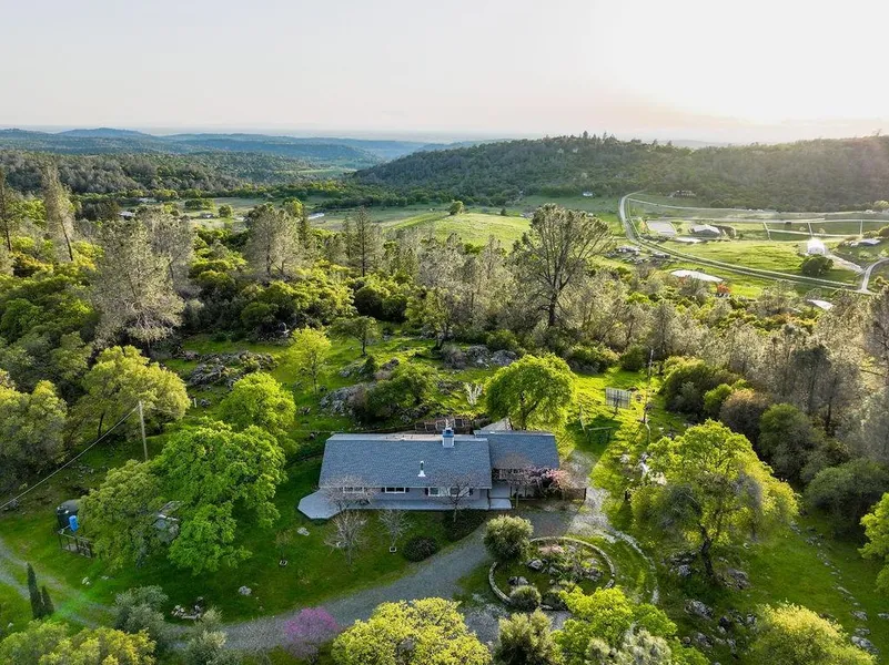 Hilltop Penn Valley single story home on 9 acres sits in a beautiful, serene, and peaceful natural setting. Gorgeous rock outcroppings. Sunrises, sunsets, and panoramic views. 1408 sq ft 3/2 single-story energy-efficient home has an open floor plan with a cathedral ceiling and abundant natural light. Less than 15 minutes to the Yuba River or Englebright Lake, 20 minutes to Nevada City & Grass Valley.