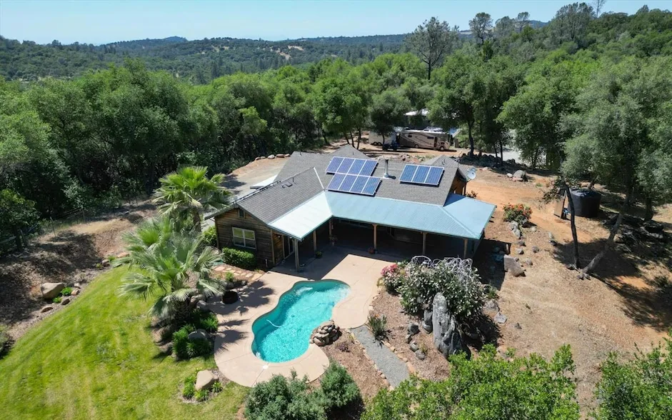 Absolutely charming one story contemporary home on 10 acres overlooking an inground swimming pool and a 5000 s. f. amazing shop in Grass Valley! Rare and unusual to find such an adorable home with vaulted knotty pine ceilings, concrete counters and a delightful open floor plan! Large bi-fold French doors open completely to the covered patio that lead out to the wonderful 15X30 inground swimming pool with views from every angle! Built with 2X6 construction, this energy efficient home has high efficiency HVAC, Aragon gas windows and additional insulation in the attic! The wrap around porch allows the light in without the heat and makes for delightful sitting areas! Alderwood cabinets, tile floors and heated floors in the bathroom. The 5000 s. f. SHOP has heat and air, bathroom with water and roll up doors, plus a mezzanine above. Perfect for an ADU in the upper level and this would be ideal for a HOME BUSINESS!! The rock fireplace and exterior facade is all from the property and chosen with care! The rooms all have 10' high ceilings and the living room with the knotty pine ceiling is 13' bringing in the natural light! All Furnishing are negotiable! Strong well, spring & just breathtaking! This is a one of a kind property that is peaceful and serene!
