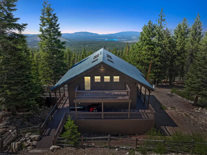 Gated 20 Acre View Mountain Estate in Truckee CA at Lake Tahoe. Juniper Hills private community in Glenshire area with stunning views of Boca and Prosser Creek Reservoirs. Furnished with easy access to Lake Tahoe's ski resorts, hiking, and fishing. This updated 4Bed/3Bath home lives like a single story, with 3 beds, a full bath, a remodeled kitchen with Quartzite counters, and a living room opening to a wraparound porch with hot tub, BBQ gas line, and parking pad on the main level. Upstairs, a 700+ sq ft primary suite features 2 oversized closets, a private deck and treetop views. The basement includes two oversized garages with 12' doors and a finished workshop with upgraded electrical panel. Enjoy a new AC condenser, furnace, tankless water heater, and keyless entry. Cleared ATV trails, RV pad with hookups, a storage shed, and a snow blower are included. New hardwood flooring throughou...