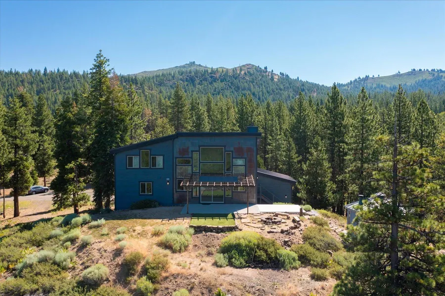 Welcome to your own private mountain retreat, where stunning westerly views of the Pacific Crest skyline give way to unforgettable sunsets. Set on 18 acres of pristine alpine landscape, this mountain-modern home was thoughtfully designed in 2016 for both everyday comfort and effortless entertaining. Step inside to a spacious great room with soaring vaulted ceilings and an open-concept design that seamlessly connects indoor and outdoor living. A cozy bonus game room just off the main living area invites friendly games of pool or relaxed gatherings. The main level features two comfortable bedrooms, a den that could easily be a 4th bedroom and a separate laundry room, while the primary suite upstairs offers panoramic views and a peaceful place to unwind. The home's striking exterior showcases wrapped cedar siding, sleek hot rolled metal accents, creative window placement, and industrial-style mesh railings-all combining to create a bold yet welcoming aesthetic. Inside, rich hickory floors, gray-washed alder cabinetry and trim, and leathered granite countertops add warmth and sophistication. This home offers flexible living options today and exciting potential for tomorrow. The zoning allows for expansion or the creation of a second dwelling-perfect for extended family, a guest house, an income-generating short-term rental. Whether you're looking for adventure or serenity, this one-of-a-kind property delivers a true slice of Tahoe paradise. Come explore the possibilities!