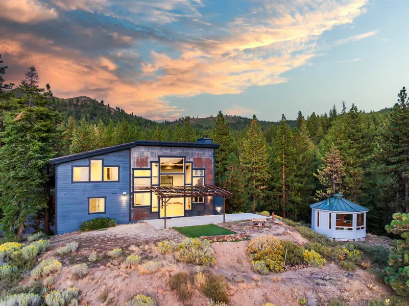 Welcome to your own private mountain retreat, where stunning westerly views of the Pacific Crest skyline give way to unforgettable sunsets. Set on 18 acres of pristine alpine landscape, this mountain-modern home was thoughtfully designed in 2016 for both everyday comfort and effortless entertaining. Step inside to a spacious great room with soaring vaulted ceilings and an open-concept design that seamlessly connects indoor and outdoor living. A cozy bonus game room just off the main living area invites friendly games of pool or relaxed gatherings. The main level features two comfortable bedrooms, a den that could easily be a 4th bedroom and a separate laundry room, while the primary suite upstairs offers panoramic views and a peaceful place to unwind. The home's striking exterior showcases wrapped cedar siding, sleek hot rolled metal accents, creative window placement, and industrial-style mesh railings-all combining to create a bold yet welcoming aesthetic. Inside, rich hickory floors, gray-washed alder cabinetry and trim, and leathered granite countertops add warmth and sophistication. This home offers flexible living options today and exciting potential for tomorrow. The zoning allows for expansion or the creation of a second dwelling-perfect for extended family, a guest house, an income-generating short-term rental. Whether you're looking for adventure or serenity, this one-of-a-kind property delivers a true slice of Tahoe paradise. Come explore the possibilities!