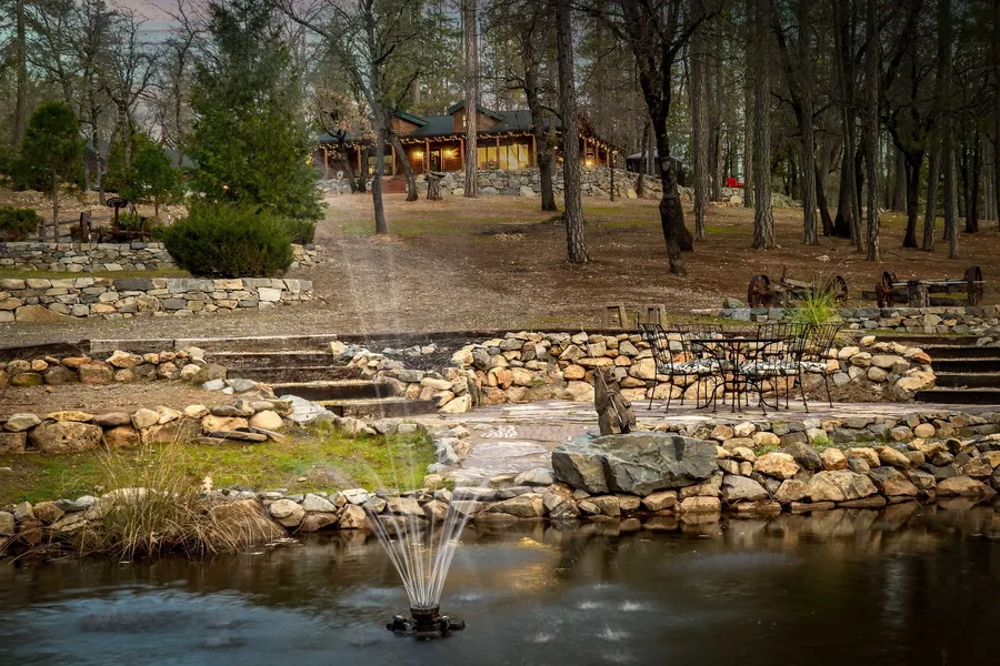 Job Transfer Forces Sale of this Single Level Log Home for Sale close to Rollins Lake. Imagine sitting on the covered front porch and listening to the waterfall cascading into the pond. Sitting privately at the end of the road backing up to 40+ acres for total privacy. Soaring cathedral ceilings with dormers and skylights and the beautiful stone fireplace brings the cozy spacious feeling. A bright open kitchen with counter seating and separate dining area with French Doors to the deck and Hot Tub. The home has lots of storage, inside laundry room, large main bedroom with walk in closet and double sink bathroom plus 2 additional bedrooms and bath. There is a separate/garage with three bays, woodstove and toilet/sink/shower area (future ADU?) and workbench PLUS a double size RV Garage with full hook-ups Newer Roof on both Home and Garage. Generator Hook up with pad. Winter and Summer Irrigation Water. Lots of room for camping, perhaps an second home getaway or AirB&B? County records showing as 2 bedrooms.