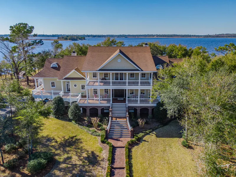 Enjoy ultimate privacy from this gated 7.8 acre river front estate with over 330 feet of water frontage. The luxurious low-country inspired home offers miles of blue water views from the grand living spaces and expansive covered porches. Interior features include 10 foot ceilings throughout the main living level, gleaming random-plank oak floors, 3 fireplaces, and walls of Andersen windows that bring in the magnificent river views. The elevator offers ease of travel to all three levels of the house. Step outside onto the private 200 foot pier and enjoy a day of boating on the Cape Fear River, Intracoastal Waterway or Atlantic Ocean. The boat dock features two boat lifts (12,000 and 18,000 pounds). The gourmet kitchen boasts an oversized granite island with raised walnut bar, custom cabinetry, ice machine, a walk-in pantry with custom tin ceiling, double ovens and Wolf range. The waterfront dining room is the perfect setting for entertaining friends and family, and features a double sided fireplace that connects to the kitchen, a custom walk-in wine cellar and spectacular views of the water. Opposite the great room, the master suite features an entry foyer with morning bar, fireplace, two large walk-in closets, and laundry room. The master bathroom is complete with cast iron garden tub, large walk-in shower, double vanities with custom cabinets, and his and her water closets. The upstairs hosts a second morning bar, three spacious bedrooms each with full bathrooms and large walk-in closets, a bonus room that can serve as a home office, as well as a dedicated laundry room for the bedroom level. Additional features include a ground level with heated entry foyer, full bath, and 3 car garage. There is a separate 1344 square foot detached garage with workshop and additional space for a car or boat. This is a rare offering that provides the very best of waterfront living, on one of the most private and serene properties in Wilmington, North Carolina.