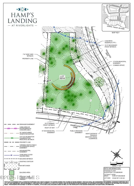 Rare opportunity - large homesite with sneak views of the Cape Fear river and long river views on upper balconies of proposed home to be constructed. Located in the heavily wooded and spacious Hamps Landing neighborhood in the sought-after waterfront community Riverlights. The community features a resort style clubhouse, zero-entry pool, fire pit, an outdoor and indoor gathering area & fitness and wellness center. Spend the day relaxing at the community pool or enjoy a day kayaking over to nearby barrier islands. You are within walking distance to Marina Village and all the restaurants, shops and other neighborhood conveniences. The neighborhood promotes community events such as artisan's markets, movies in the park, concerts and sip n shops. Located less than 10 minutes to Carolina Beach or Historic Downtown Wilmington, this homesite offers the perfect, central location. Call Kevin today to learn how to build a custom home on this site. DISCLAIMER Although the property elevation is above the flood map elevation it is currently considered in Flood Zone AE 9. Owner is in process of obtaining a recordable Letter of Map Revision to exclude the buildable area from the flood zone allowing owner to qualify for federal flood insurance. BUYER IS REQUIRED TO ENTER INTO HOUSE/LOT PURCHASE AGREEMENT WITH PBC DESIGN+BUILD. SEE PROPOSED CONSTRUCTION LISTING.