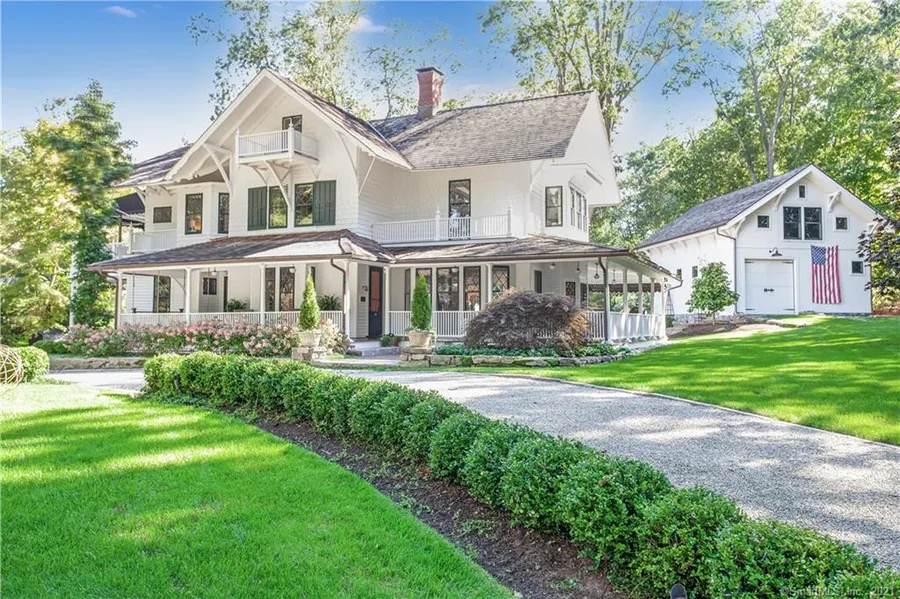 This former residence of Princess Pignatelli was built as a Swiss Chalet in 1897 and allows you to enjoy the charm and beauty of that period with the convenience of the 21st century. The 9 foot ceilings, 5 fireplaces, primary suite with a dressing room, full spa like bath, and the .97A site with deeded rights to a sandy beach, yet located in the heart of the village make this a very special home. This home enjoys a wrap-around porch, front and back stair case, new state-of-art kitchen, all new bathrooms, natural gas heat, special spa area, wine tasting room, safe room, plus a two bedroom area on the 3rd floor with full bath, sitting area, kitchenette and laundry. This area is perfect for a nanny, house-keeper or long term guest. Just a few of the newer features are: 12 zone irrigation system, natural gas back-up generator, a recently constructed heated/cooled post and beam carriage house with a second floor recreation room, new cedar shake roof and upgraded electric system to 400amps. The many gardens and landscaped areas were professionally designed with privacy, low maintenance and year round beauty in mind. A conversation area surrounds the built in fire pit. You will enjoy being nestled between your beach and the village of Madison with its many amenities. Enjoy concerts, antique shows, Farmer's markets and other events on the near by Village Green. Easy access to I-95 and train service makes this an ideal situation. This home is certainly worthy of your inspection.