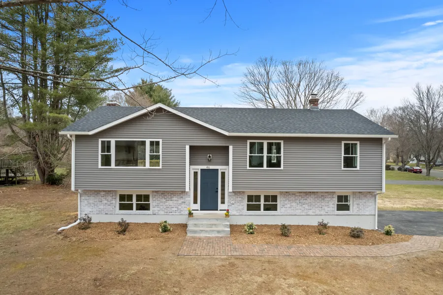 Almost New Construction! 46 Russo Drive has had a complete transformation! Turn the key to this beautiful over the top raised ranch in a great community with lake access. Over the past three months new siding, new roof, new windows were all installed. The interior was gutted and re done. Kitchen has been remodeled and open to the living room/dining room area. Shiplap and electric (changing color) fireplace has been added to the living room. The kitchen is done with cabinets and oversized crown molding to the ceiling, center island in accent color with 3 pendant lights. All new stainless appliances, and hood. The counters are quartzite -Dolce Vita Light - extending over the island for barstools. Recessed lighting added to kitchen. New 3 1/2" red oak has been installed through out the main living floor. Stained and finished. The existing stair case was removed and a new staircase was installed. Built with new posts, railings and upper stairs. Stained to match the hardwood flooring. A master bathroom was created with tile floor, tile shower, all new plumbing, new vanity, tastefully decorated with neutral coloring. Main bathroom has a tub with tile walls, tile flooring, new vanity, new lighting. The lower level has newly installed Karastan carpeting, wood burning fireplace, bedroom and lower level full bathroom fully remodeled. All new lighting through out. All new 2 panel doors and black matte accents. Upgraded electrical panel. Newly installed heating and cooling system.