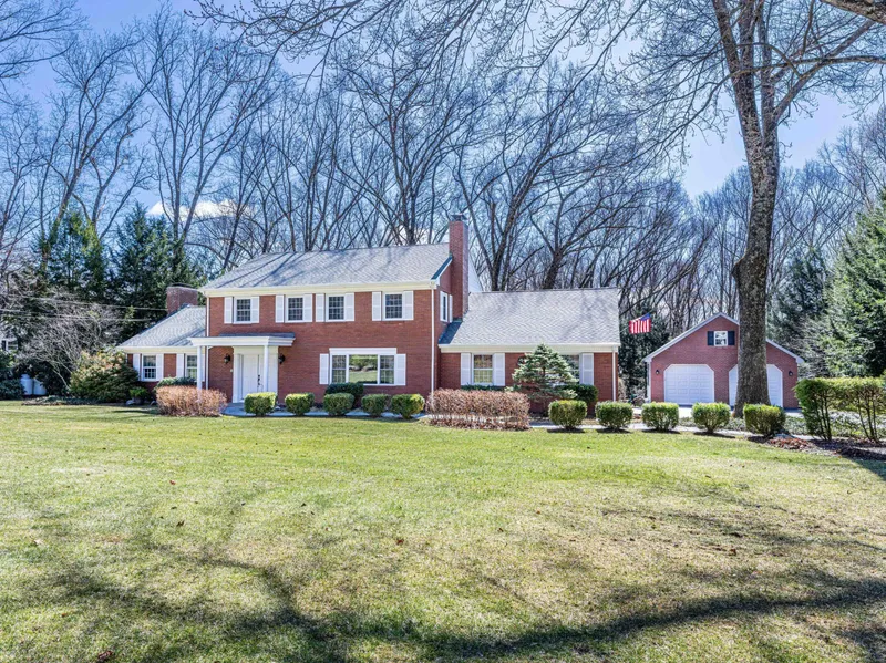 This stately brick colonial stands on a rare, level, and private 1.21 acre lot. A setting that's hard to come by and even harder to forget. With over 3,200 square feet above grade and an additional 750 square feet of finished space below, this home offers a timeless layout and room to live comfortably, entertain easily, and enjoy every season. Step through double doors into the foyer and immediately feel the sense of space and classic design. To your left, the living room centers around a fireplace. Straight ahead, the dining room welcomes you with built-in hutches and charm. To your right, the family room, complete with a wood stove insert in its second fireplace, becomes a cozy retreat in colder months. The kitchen offers granite counters, a double oven, and abundant cabinetry-opening seamlessly into a show-stopping enclosed porch with cathedral ceilings, bluestone flooring, and full views of the backyard through a wall of windows. Two half baths and a home office on the main floor add convenience without compromising flow. Upstairs, the primary suite impresses with a full dressing room and a renovated bath featuring a dual shower, double quartz sinks, and a built-in vanity. Three more bedrooms share a double-vanity hall bath and a cedar closet. Outside, enjoy the privacy of a paver patio and space to spread out. This home offers both an attached 2-car garage and a detached oversized 2-car garage built in 2016 with attic storage above.