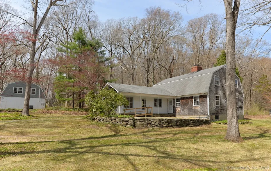 A wonderfully unique and naturally beautiful property which includes a 5 bedroom home offering a flexible floor-plan. To the right of the foyer is the formal living room which is oversized and focused on a wood burning fireplace flanked by built-in book shelves. The formal dining room is found to the left of the foyer and has a handy pass thru to the kitchen. The interior of the home has been freshly painted and the hard wood floors restained and refinished. The kitchen is open to the family room where more built-ins can be found. Also off the foyer is a full bath and large bedroom. First floor master or in-law or office? Upstairs four more bedrooms surround another full bath with tub/shower. The basement is unfinished but includes a walk out and lots of room for a workshop and/or storage. The detached two car garage includes a one bedroom apartment above, which has an updated heat pump HVAC system. The grounds are lightly wooded and level and the stone patio looks down on the pond. Owned and loved by a single family since construction.