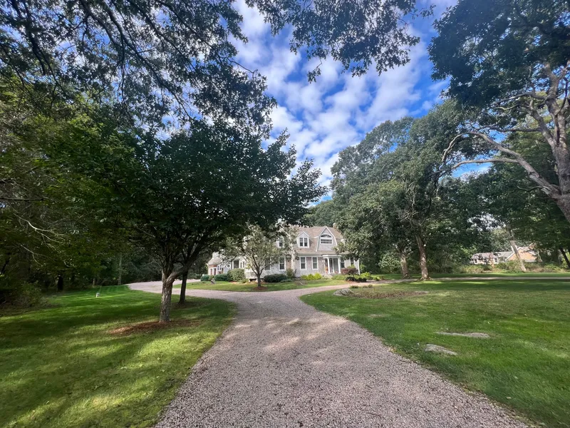 Stately New England Coastal Colonial nestled on 2.93 acres. Located on a quiet country road surrounded by stone walls with a circular driveway and near Stonington Harbor. 5 Bedroom 3 and 1/2 Bath home offers 4,878 Sq Ft of living space including a FIRST FLOOR Primary Bedroom Suite with fireplace. Custom built 2004 by Local established builder. Dramatic 2 story entrance foyer with floor inlaid with a compass rose. Eat-in Gourmet Chefs Kitchen, Formal Dining Room, Glistening Cherry Floors, 2 gas fireplaces - one in primary bedroom and one in study, and a pellet stove in living room. Fine details, craftsmanship and workmanship throughout. Ideal spaces for your private Yoga or Pilates studio. Lovely private patio ideal for al fresco dining, 2,350 sq ft basement with 660 sq ft finished, spacious cedar closet and walk-out. Ipe Deck, and so much more. Enjoy your 35'x19' Media-Game Room over spacious attached Oversized Two and a Half Car Garage. Full whole house generator. Located out of the Flood Zone and near Deep Water Marinas, Stonington Borough and Historic Downtown Mystic.