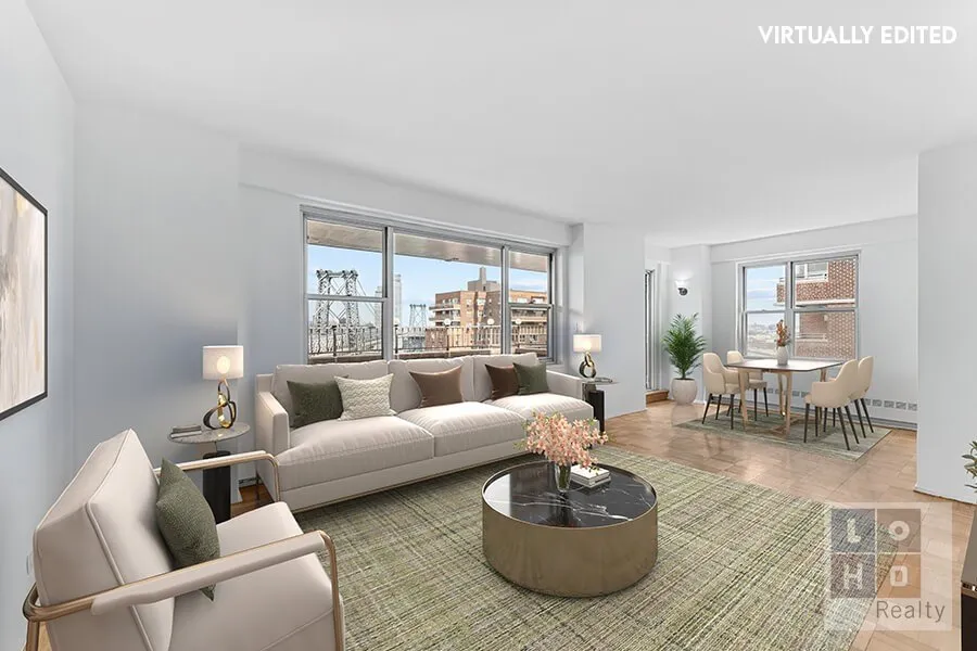 **All appointments - including Sunday Open Houses - are by appointment only. If you are working with another agent, that agent needs to reach out to make the appointment and is required to be present** **Breathtaking sunrises, sunsets, and sweeping panoramic views of the East River, Williamsburg Bridge, and uptown Manhattan skyline await you in this hidden 18th-floor gem!** Relax, entertain, dine, barbecue, or simply unwind on your own private 285 sq. ft. terrace-an effortless extension of the expansive living room. The windowed kitchen-accessible from both the living room and oversized entry foyer-features a cozy, dedicated dining area. For those seeking an open-concept layout, the kitchen walls can be fully or partially removed to create an airy, light-filled space perfect for modern living. At the opposite end of the home, you'll find a windowed bathroom with a deep soaking tub and a ...