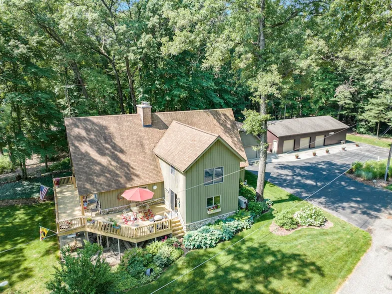 Discover lakefront paradise with this stunning 4-bedroom, 3-bath home on Bills All Sports Lake. Enjoy breathtaking views and direct lake frontage on the expansive 204-acre lake. Inside, cathedral ceilings amplify the spaciousness, complemented by two kitchens and a versatile lower level with a walkout basement that could serve as additional living quarters. Step onto the large wrap-around deck to soak in panoramic vistas, or enjoy outdoor activities on the pickleball court. Additional features include a cozy fireplace, a 3-stall pole barn for ample storage, and wooded areas with trails for exploration. Indulge in fishing, swimming, and boating right from your own backyard. The possibility of a fully furnished home ensures immediate comfort and convenience. Additional parcel 2030465002 This property offers an unparalleled blend of luxury, recreation, and natural beauty, perfect for those seeking the ultimate lakeside lifestyle on Bills Lake.
