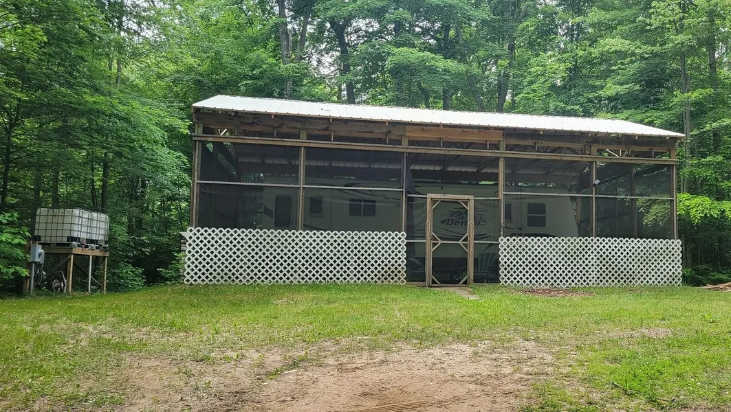 8 acres of wooded land with electric. There is a 2006 Denali travel trailer that sleeps 4 under a screened enclosure with a metal roof and cement patio area. There are 3 primitive campsites, two with tent pads. There is a pergola with a picnic table on a cement patio, two fish cleaning stations, water storage containers, an outhouse, several campfire pits and a large steel storage container. Wildlife and privacy abounds on this secluded property. Property is located one mile south of the Diamond Lake entrance to access a public boat launch and public swimming beach. Diamond Lake is No Wake from 7 PM-11 AM. Enjoy great fishing and boating on the lake and good pizza at Shindy's General Store & Gas Station. This property would make a great family camp getaway or hunting retreat. Buyer must have an appointment before walking property. Property is gated.