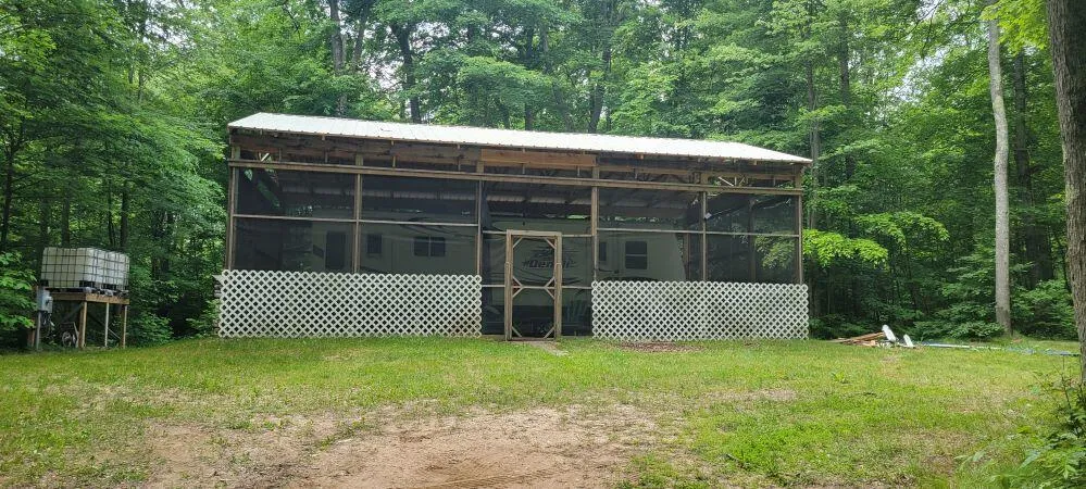 8 acres of wooded land with electric. Includes a 2006 30' Denali travel trailer that sleeps four under a screened enclosure with a metal roof and concrete patio area. Camper septic available. There are 4 additional camp sites. 3 with tent pads, fire rings and lamp posts. The fourth is a primitive camp site. There is also a pergola with a picnic table on a concrete pad, two fish cleaning stations, water storage containers, an outhouse, several campfire pits and a large steel storage container. Wildlife and privacy abound on this secluded property. Property is located 1 mile south of the Diamond Lake entrance to access a public boat launch and public swimming beach. Diamond Lake is No Wake from 7PM-11AM. Enjoy great fishing and boating on the lake and good pizza at Shindy's General Store & Gas Station. This property would make a great family camp get-a-way or hunting retreat. Property has been leased as a Hipcamp property in the past.