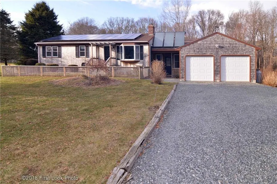 This could be your forever home! 1540 square feet on one level makes this the perfect opportunity for first time Buyer, retirement home or anyone in between! Tongue and groove pine paneling and fireplace with pellet stove insert cozy up the open floor plan and lend a resort/lodge like feeling. 3 beds and a full bath that also has access directly from master bedroom complete the original portion of main home. In 2005 an addition was added that's perfect for teen or guest suite, family room or home office with a second full bath and its own entrance and access to 2 car garage. Seller has updated mechanicals and worked to make this home energy and cost efficient, solar panels provide free electric and save on oil consumption for hot water during most of the year, whole house generator is included! This partially wooded lot just gets prettier as Spring comes and is close to beach, hiking/biking conservation areas and historic Tiverton 4-Corners