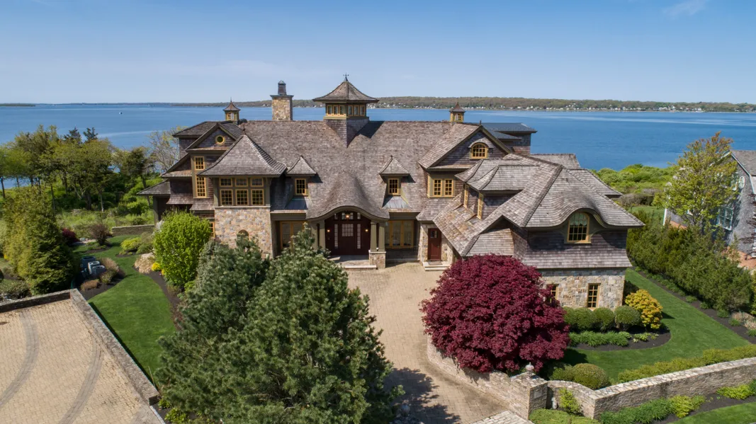 Private waterfront estate comprising 1.37 acres set on Narragansett Bay with panoramic water views from all angles of the home. The quality and craftsmanship are unparalleled in this shingle and stone home designed by Carmelo Architects. Entering through the front into the great room, you are greeted with large cathedral ceilings, custom woodwork, and a floor-to-ceiling stone fireplace. The open floor plan continues into the chef's kitchen, where there is room to cook, eat, and relax with the glistening water in the background. Glass doors open onto the rear stone patio that runs the length of the house and is centered with a tiled infinity pool that gives way to the bay. A large private suite with an attached spa bathroom boasts custom tile, walk-in closets, and a large soaking tub to finish off the main floor. One level up, you will find three additional bedrooms, all with ensuite baths and one that could be used as an au pair suite with a separate living area. There is also a fitness room with a steam shower and balcony that makes exercising effortless. The third floor has two offices with custom built-ins and water views. A custom hallway of wood-paneled walls and ceilings separates them. Finally, the lower level finishes off the over 10,000 square feet of the home with a theatre room, a wine cellar, and a bar that opens into a pool room and walks out into the rear yard with a path down to the beach. The neighborhood is home to the Aquidneck Clubs golf, tennis, and marina. Simply an exquisite estate!