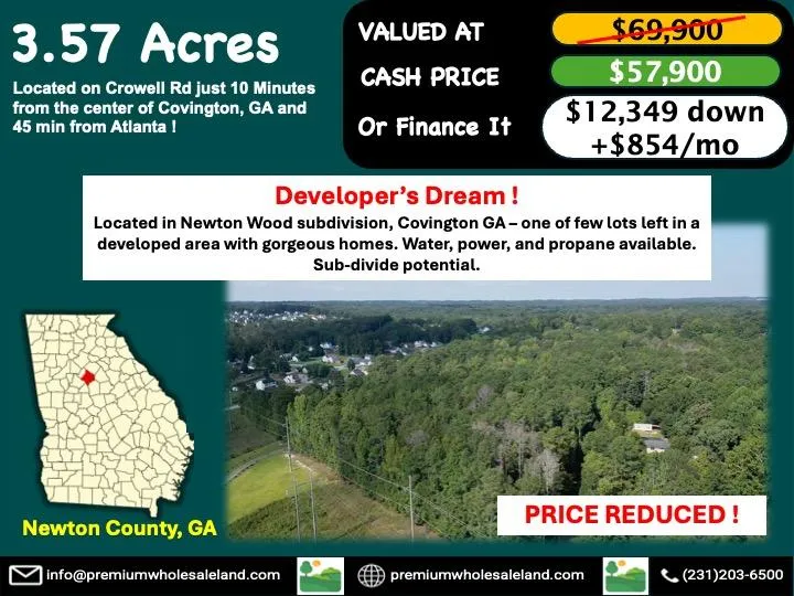 Dont miss your chance to own 3.57 wooded acres on Crowell Rd, just 10 minutes from downtown Covington and 45 minutes from Atlanta. This gently sloped lot (640660 ft elevation) features 175 feet of paved road frontage with water, power, and propane available making it a perfect investment for home developers. Zoned Agricultural Residential (A-R), you can build a single-family home (site-built, modular, or Class A manufactured) with potential for a tiny home as an accessory dwelling. This lot offers subdivision potential, No HOA, proximity to shopping, dining and area attractions such as Cedar Shoals Park, Walker Marina, and the Atlanta Botanical Garden. Large lots in Newton Wood are rareso act fast to secure this investment opportunity before its gone!