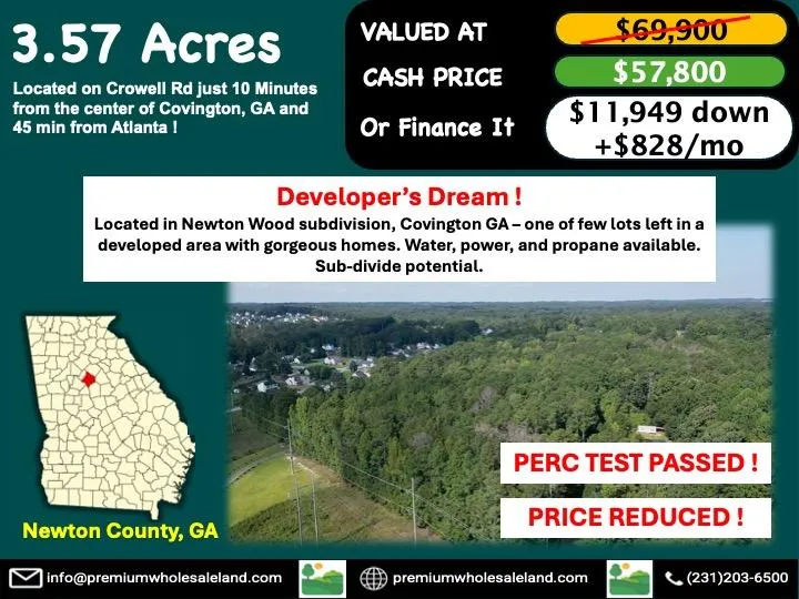 Dont miss your chance to own 3.57 wooded acres on Crowell Rd, just 10 minutes from downtown Covington and 45 minutes from Atlanta. This gently sloped lot (640-660 ft elevation) features 175 feet of paved road frontage, water, power, propane and a passed Perc test available making it a perfect investment for home developers. Zoned Agricultural Residential (A-R), you can build a single-family home (site-built, modular, or Class A manufactured) with potential for a tiny home as an accessory dwelling. This lot offers subdivision potential, No HOA, proximity to shopping, dining and area attractions such as Cedar Shoals Park, Walker Marina, and the Atlanta Botanical Garden. Large lots in Newton Wood are rare so act fast to secure this investment opportunity before it's gone!