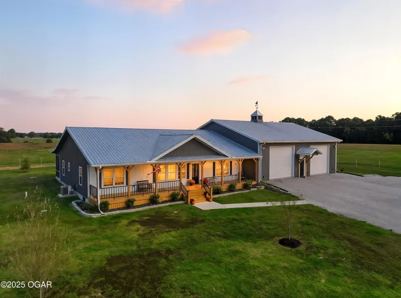 Custom 4,160 Sq. Ft. Barndominium on 10.9 Acres - The Ultimate Blend of Comfort, Function, and Country Living! Discover the perfect balance of luxury and practicality in this stunning barndominium located in Newton County, just south of Joplin. Featuring 2,160 sq. ft. of modern living space and a 2,000 sq. ft. climate-controlled shop, this property was thoughtfully designed for both everyday living and serious hobbies. Inside, enjoy a spacious open-concept great room that seamlessly combines the kitchen, dining, and living areas-ideal for entertaining or quiet evenings at home. The split-bedroom floor plan provides privacy, while luxury vinyl plank flooring, soft-close cabinetry, and granite & quartz countertops add timeless appeal. A walk-in pantry, dedicated laundry room, and ample storage ensure everyday convenience. The 18' x 16' primary suite offers a peaceful retreat with a spa-like ensuite bath and oversized walk-in closet. Two additional bedrooms and a half bath complete the functional layout. The attached 2,000 sq. ft. shop is climate-controlled and ready for your next project-perfect for work, storage, or recreation. Step outside to enjoy a full-length covered back porch, screened-in sitting area, and an enclosed mancave ideal for gatherings or hobbies. Property highlights include 10.9 acres of gently rolling land, a 30' x 40' machine shed, 6-strand barbed wire fencing, and a gated entrance offering privacy and peace of mind. With an all-electric, energy-efficient build and rural water, this property truly has it all-space, style, and self-sufficiency.