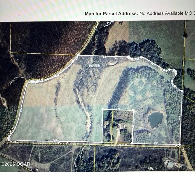 Buffalo Creek Frontage! This beautiful property has 60.8 acres ready for you to build your dream home today. Located in the Neosho School District this property has it all. Buffalo Creek and Harrison Branch meet on the property. Lovely large pond, electric., and well (condition unknown) to the East of the pond. Owner/Agent