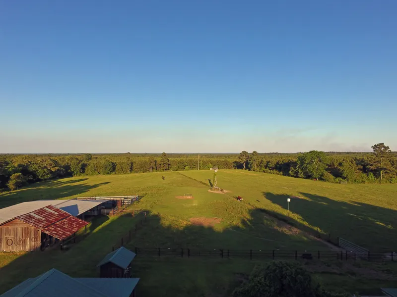 into 4 separate pastures, additional hay pasture, a working windmill, pond, 30x60 hay barn, working pen, horse stables, chicken pen,