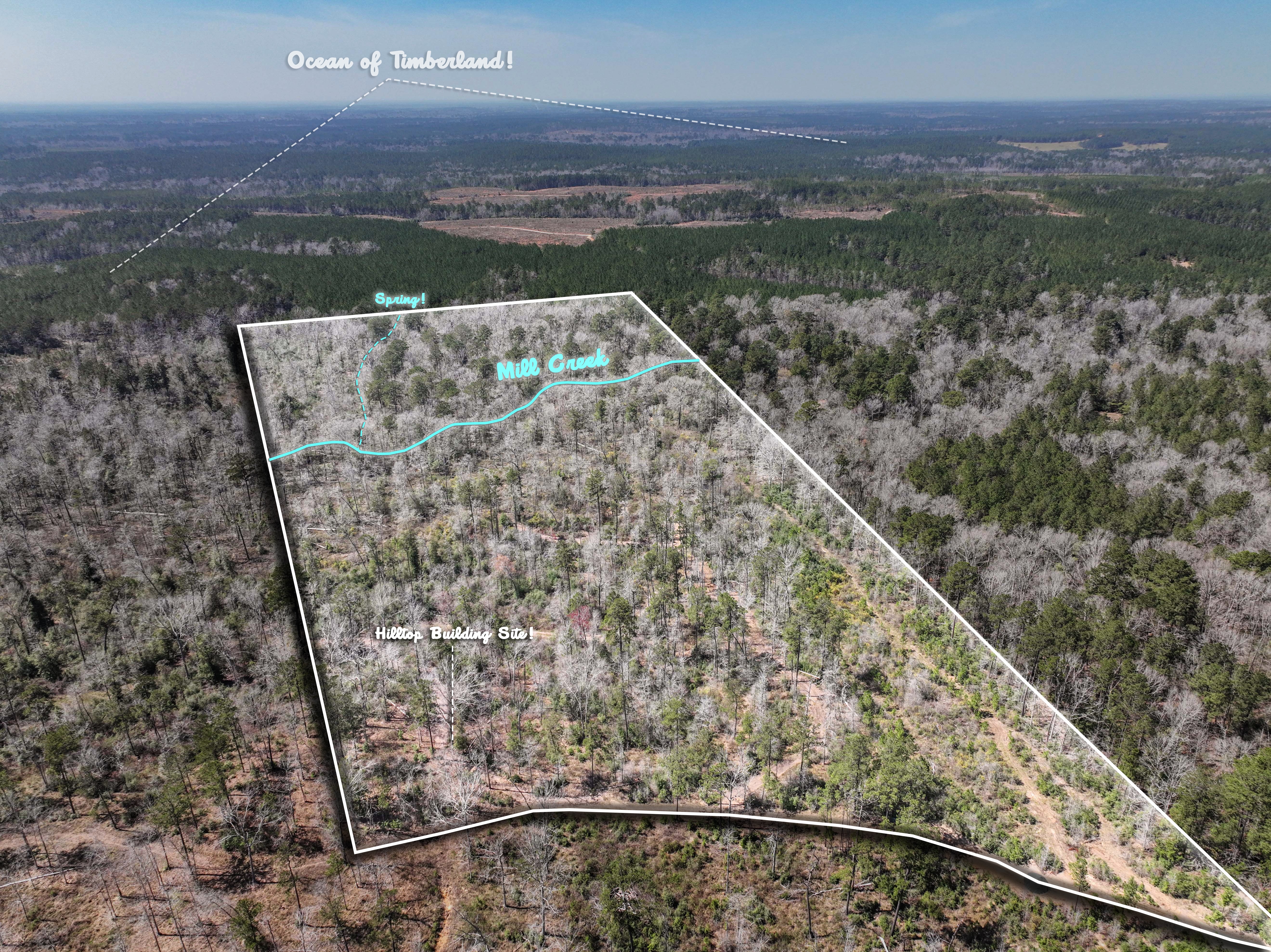 The terrain is diverse and well-balanced. On the front side, a large hill covered in mature hardwoods overlooks the creek bottom, offering the perfect elevation for a cabin or hunting camp. On the back side of the creek, you'll find a 7-acre stand of mature timber, loaded with big white oaks, a deer hunters dream. With thousands of acres of uninhabited company-owned timberland surrounding and beyond this property, the whitetail deer hunting potential is off the charts. Also, the 5 acre portion of creek bottom before MilL Creek has grown back in natural regeneration, creating a thick area for bedding and refuge. Many game trails can be spotted in this section.