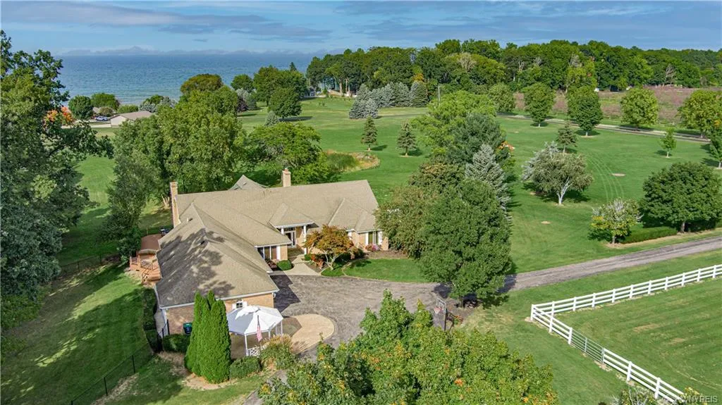 Pristine and meticulously maintained ranch on a 20 acre property with gorgeous views of Lake Ontario. Open floor plan, custom kitchen w/ Granite Counters, center gathering island, inviting large eat in area w/ fireplace. Oversized windows! Family room with fireplace. Den with custom built ins (4th bedroom) Perfect for home office! Amazing great room with skylights, cathedral ceilings and fireplace. 3/4 bedrooms. Primary ensuite w/ 2 walk in closets, spa bath. Home includes mudroom, 1st floor laundry and basement with walk out and finished room. 3 car attached garage. Expansive deck for entertaining. Magnificent state of the art 7,200 sq foot lighted indoor area (w/ soft footing). 13 stall barn w/ viewing room, bathroom, tack room, wash rack, full second story walk up loft. 10 acres w/ separate paddocks & vinyl fencing. 4 loafing sheds. 2,400 additional sq foot heated "work shop" area w/ 2 double garage doors. Fenced in dog area with heated dog kennel! Well appointed with many additional uses...winery, wedding venue, brewery or subdivide or enjoy as is.